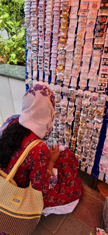 In the picture: “Enjoying one of my favorite hobbies since arriving in India: shopping for jhumka earrings at roadside stalls!”